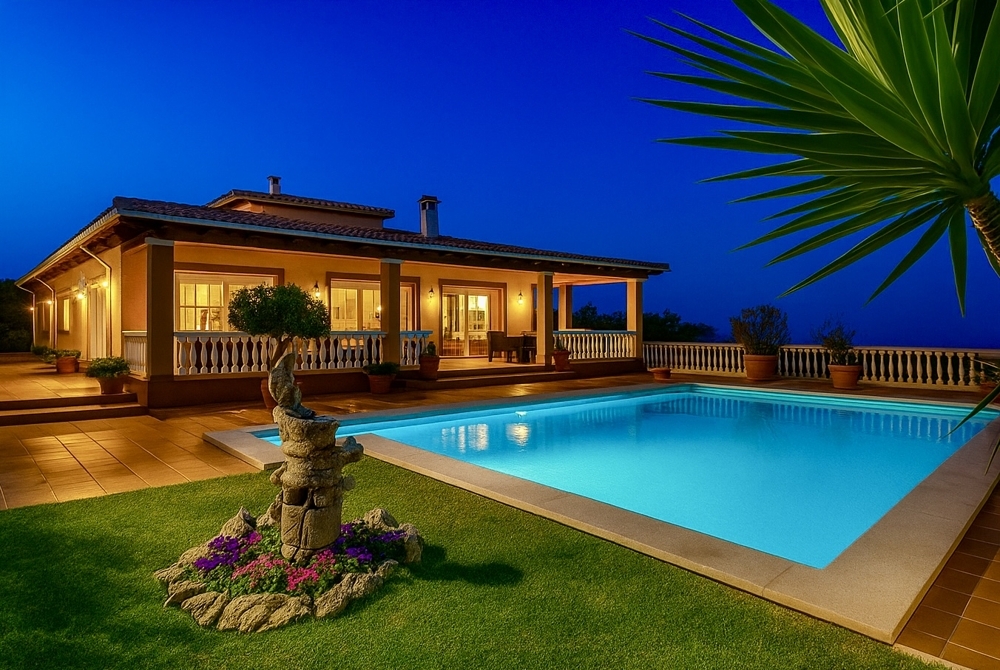 Objektbeschreibung Dieser Bungalow in einer der begehrtesten Lagen von Nova Santa Ponsa vereint mediterranen Flair mit höchstem Wohnkomfort – und das auf nur einer Ebene. Die durchdachte Architektur macht ihn zur idealen Wahl für alle, die ein barrierefreies und zugleich stilvolles Zuhause suchen. Auf einem großzügigen Grundstück von ca. 1.051 m² bietet die Immobilie rund 368 m² Wohnfläche, die sich auf vier geräumige Schlafzimmer, zwei davon mit en-suite Badezimmern, insgesamt vier Bäder sowie ein Gäste-WC verteilen. Der lichtdurchflutete Wohn- und Essbereich mit offener Einbauküche schafft eine einladende Atmosphäre und öffnet sich direkt zu den sonnigen Terrassenbereichen. Ein Ankleidezimmer sowie ein weitläufiger Kellerbereich mit Fitnessraum, Waschküche, Abstell- und Hauswirtschaftsraum bieten zusätzlichen Komfort und viel Stauraum. Der Außenbereich lädt mit offenen und überdachten Terrassen, einem Salzwasserpool und einem Grillplatz zu entspannten Stunden im Freien ein. Die Dachterrasse rundet das Angebot mit einem herrlichen Blick auf die umliegende Berglandschaft ab. Besonders hervorzuheben ist die großzügige Tiefgarage mit aktuell vier Stellplätzen, gesichert durch ein elektrisches Tor. Für Autoliebhaber bietet sich hier ein seltenes Potenzial: Auf einer Fläche von ca. 200 m² könnten weitere Stellplätze realisiert werden – ideal für Sammler oder Fahrzeug-Enthusiasten.